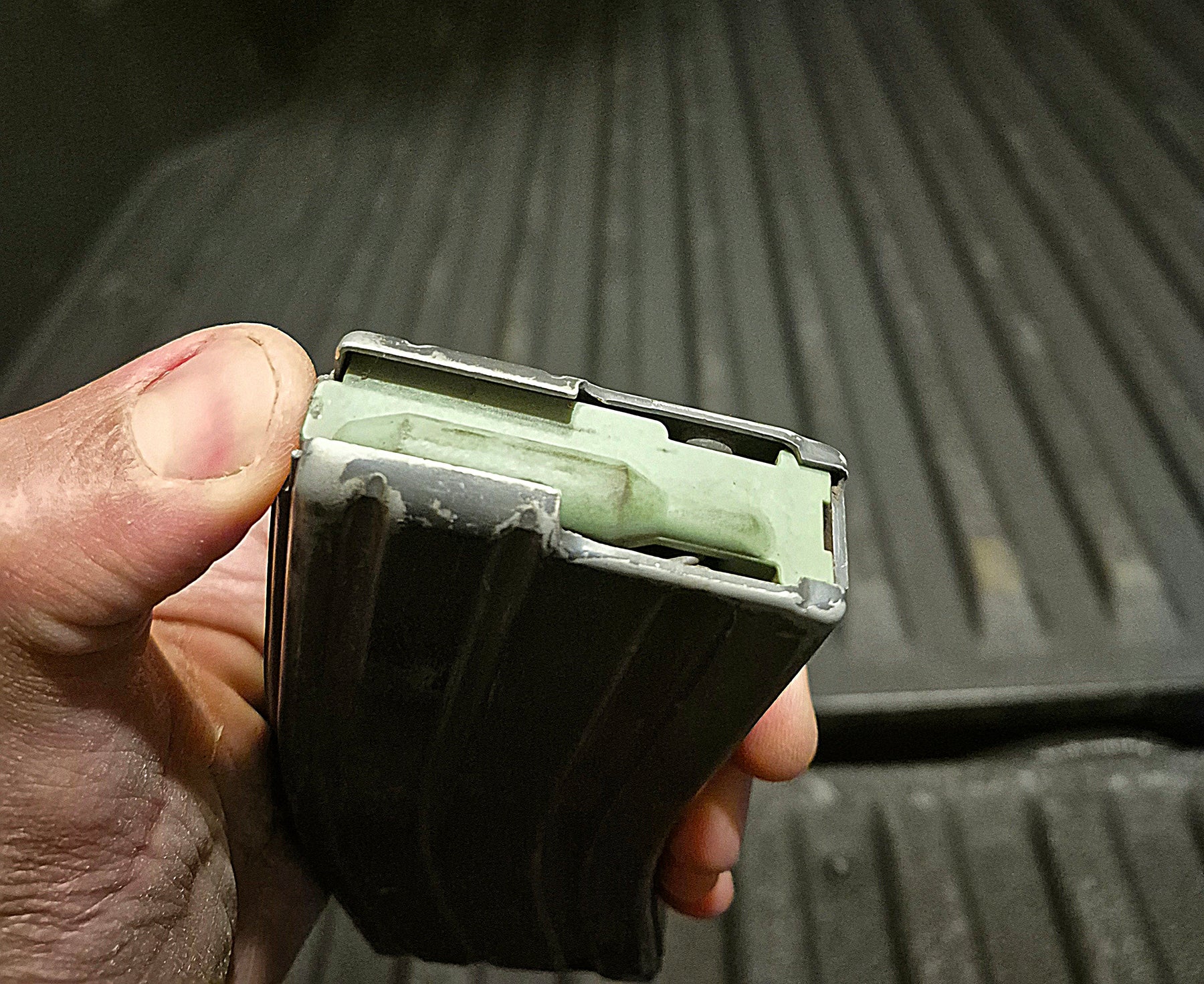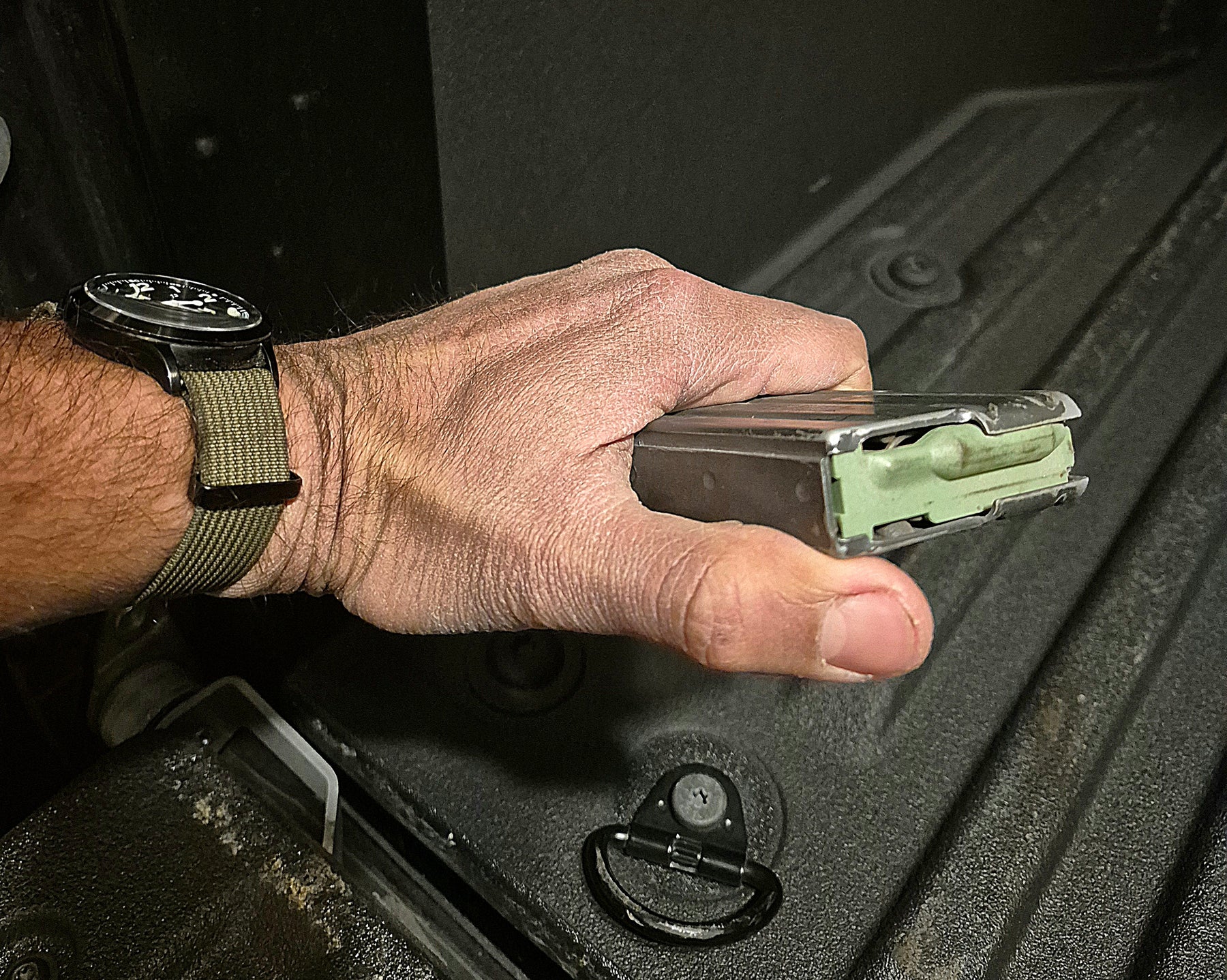 Hand holding DURAMAG aluminum magazine with green follower, shown against truck bed background
